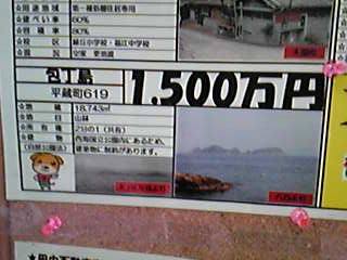 当店の並びに 不動産屋さんがある 当然店頭には 物件の情報が張り出してあるわな ここの不動産屋さんは 入口がブティックと共有なので こんな感じで掲示してある 土地付きの一戸建て住宅が 中古でこの値段 安いね~ で 良く見てみると ん??・・・ なんと物件に 島~!! 「包丁島」 1500万円 中古住宅とお値段同じ しかも 住所まであるし・・・ お金に余裕がある方 買って独立国作る? 賃貸あれば借りたいわ~ 「包丁島」 福江港の東北の海域にある包丁島周辺は 福江海中公園に指定される美しい海 サンゴが茂り熱帯魚が泳ぐ 見事な海中景観となっており ダイビングスポットや 磯釣りに最高の場所となっています 「福江海中公園」 西海国立公園に指定された 竹の子島・屋根尾島・多々良島・包丁島・サザエ島(福江港の東北3.5km)の 西北海域は海の透明度も高く 対馬暖流の影響で エダミドリイシ・カワラサンゴなどの石サンゴ類が群落をなし イソバナ・ウミトサカ・ホンダワラ・アマモなどの海藻草類が混生 ベラやスズメダイなどの熱帯魚が遊泳する 国立公園内の11.2haの海域が 福江海中公園に指定され自然が大切に保護されている