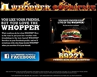 さすがと言うかまたまた ハンバーガーチェーン店のイベント ご存じ「バーガー キング」です ワッパーはデカくて美味しいですよね そのワッパーが無料でもらえるのです Facebook向けに ユニークなアプリケーション 「WHOPPER Sacrifice」の提供を開始しました どのような事かと言いますと このアプリをインストールして Facebookの友達リストから10人削除すると 大事な友達を犠牲にしてでも食べたいくらいの ワッパーへの愛を証明したとして このバーガー1個と無料で交換できる クーポンを受け取ることができるというもの アプリをインストールすると 友達リストのところに「犠牲にしたい友人をクリックしよう」の文字が表示され 友達の写真をクリックすると その友達がリストから削除され しかもアクティビティーのフィードに その友達をワッパーのために犠牲にしたことが掲載される 早い話「mixi」のマイミク10人削除したら 「ワッパーもらえますよ」的な事です キャンペーンサイトに表示されている 犠牲となった友達の総数は 1月10日現在既に約7万人に上っているそうです・・・ 7万人の人は ハンバーガーよりその人にとっては 必要じゃなかったのね・・・・ Facebook http://e-words.jp/w/Facebook.html