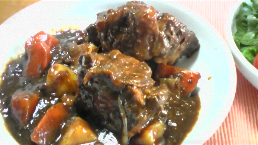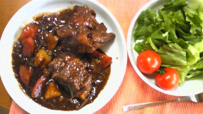 本日のお昼ご飯は 昨日からデミグラソースで煮込んだ 「テールシチュー」です 五ほるの取引先の 肉屋さんで購入しました 牛テールは 毎週殺畜があった時にしか手に入らない貴重品 1頭分で¥1500 扶養家族が多いので2頭分購入しました 元の方の部分は 大人の♂の拳よりデカイので 食べ応えたっぷり! なので2ピース食べると少しばかりクドクなります 1ピースで腹いっぱい・・・・ 大量にあるので 多分明日のお昼も食べます 食べなければなりません・・・
