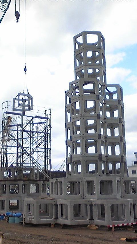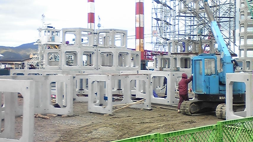 数日間の寒波も和らぎ 天気は余り良くないですが 久しぶりの風の無い穏やかな日 路面もドライ状態なので いつもの散歩道です 数日埋立地の端に行かなかっただけなのに またまた「ニュータイプの消波ブロックか!?」と思ったら 今度は「漁礁」でした 何かこんなゲーム あったような気がする・・・ こんなパーツを 積み上げていきます パーツ1つの高さが150cm程あります なので1つの漁礁は 15m位で5階建てのビル程の高さです しかしここで問題です ブロックすべては固定されているのに 移動させる時はどうするの? クレーンで吊るにしても 上の方で吊ったらコンクリートが 重さに耐えられないからNG 下で吊るにしてもバランスが取れないのと 重さに耐えきれないので同じ・・・・ どうする??