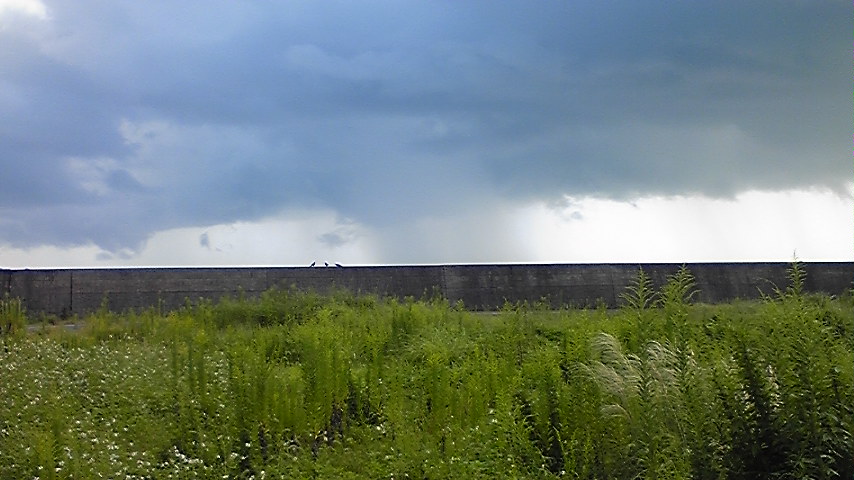 いつもの散歩道をワンコと散歩中家から400Mほど行ったところで 突然の豪雨に襲われ あっという間に私と2匹のワンコはずぶ濡れです その時気が付いたのが「洗濯物」です 「ヤベ 出しっぱなし・・・」 今日は母ちゃんがサロンでの仕事があるために家には誰も居ません そんな豪雨の中我が家のほうを見ると 「あれ??」 雨が降っている形跡が無い?? そうです 私からわずか300Mほど離れた所からは道が乾いているのです なので洗濯物は無事でした 犯人はこいつです アスファルトの照り返しが 打ち水を打った様に涼しくなったのはとてもありがたいのですが 海に入ったぐらいにずぶ濡れ状態・・・ 時間にしてわずか5分ほどの豪雨の後は 青空が広がる晴天に逆戻りです そんな「ゲリラ豪雨」は西の海上に豪雨を降らせながら移動して行きました