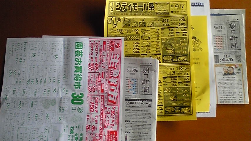 都会に住んでいると 金曜日・土曜日の週末の新聞 結構楽しみな人みえるのではないですか? 特に主婦・セール好きな あ・な・た 別に買い物をする訳でも無いけれど私も個人的に楽しみです 理由は折込チラシですよね 連休・週末になれば 本紙よりも分厚い折込が入って来ますよね パチンコ店・分譲マンション・スーパーetcはもちろんの事 最近はコンビニのチラシまでもが折り込まれて来ます この五島でも折込入ってきますよ ほら 左側が昨日 金曜日のチラシ 右側が本日 土曜日のチラシ 合わせて5枚・・・・ 寂しい・・・ しかも土曜日の一番大きくて綺麗なチラシは 分譲マンションのチラシ しかも長崎市内の・・・・ I have a Dream 私には夢があります いつの日か本紙より分厚い折込が入る日が来る事を マーチン・L・キング牧師談