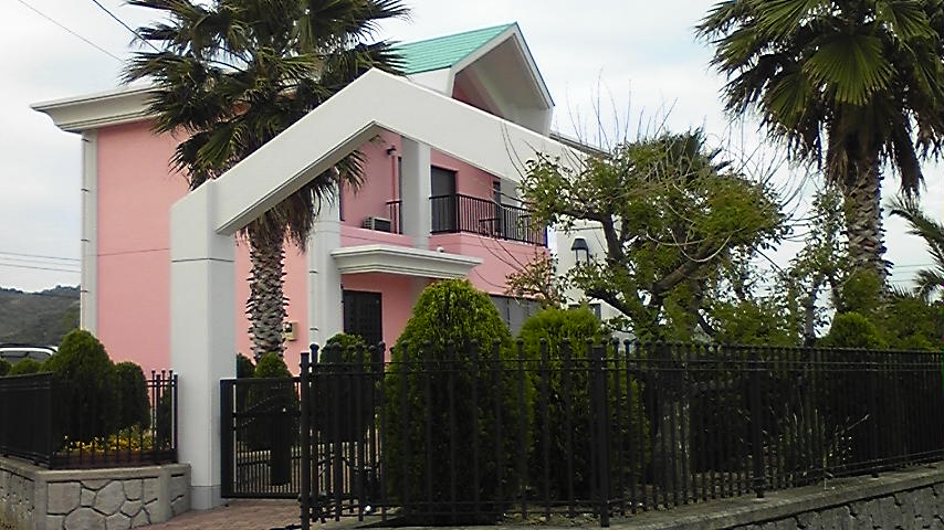 五島の住宅地にひときわ目立つ家があります ワイキキのホテル? みたいな感じの家です 外壁もピンクで柱が白の派手な家なんです 五島の人も「すごか~っ」って思ってると思います この家です ↓