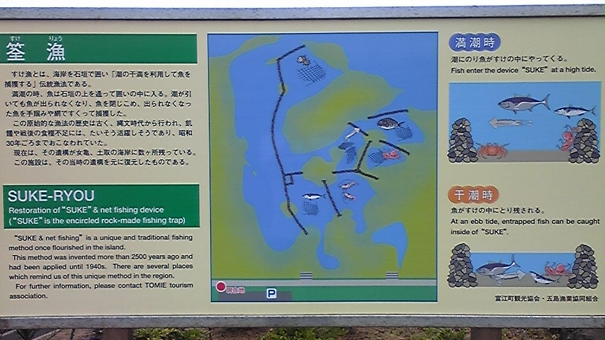 昨日ラーメンを食べに「富江」に行ってきたので 少しばかり富江観光をして来ました。 五島市は平成の大合併で 福江島全部の市町村が合併して「五島市」となり それまでは 「三井楽」・「岐宿」・「戸岐」・「玉之浦」・「富江」など町村があり 市は「福江」だけでした。 現在の富江に信号機は 点滅用の一つ目の信号機が一対 他にはレギュラータイプの信号機が小学校前に一対あるだけです。 多分学校前の信号機も本当は いらないんだけど 子供の教育用に設置してあるような感じです そんな富江にも沢山の観光スポットがあります ここの海では潮の干満の潮位の差を利用した 漁が行われています。 正面に見えるのが 五島のダイヤモンドヘッド 「鬼岳」です その名も「すけ漁」です。 詳しい漁の説明は 看板をお読み下さい 英語でも案内させていただいております。 すぐ隣には 「さんさん富江キャンプ村」 ここでは キャンプはもちろん マリンスポーツやディスクゴルフなどが できます。 & 美味しそうな「五島牛」 & Mr.マリックの様な 食品サンプル まだまだ沢山の観光スポットがありますが 今回は時間の関係上ここまで。 福江島すべての CVS 3店の内の1店は富江にあります。