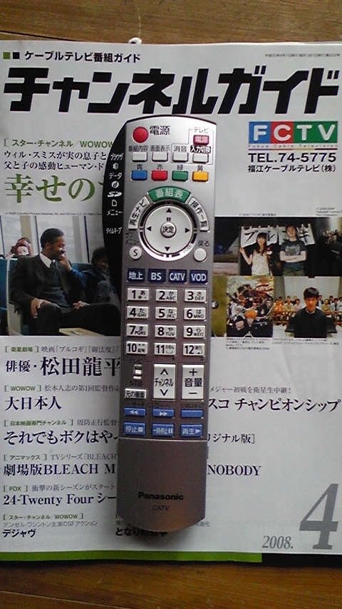 何か「サッカークラブ」のようなタイトルでしょう? これねえ 「福江ケーブルテレビ」 略して 「FCTV]なんですよ。 五島にもケーブルTVあるんですよ 驚きました? まだ数年前に出来たんですけどね。 前回五島のchは NHK・民放併せて6chと書きましたよね 覚えてますか? それでは物足りないと思って BS放送とスカパーを付けようと思ったんですよ BSは アンテナ スカパーは チューナー・アンテナ を共に持ってたので 金は掛からないと思いましてね。 いざ取り付けようと思い 辺りの家の屋根を見ると 「ん???」 お隣さんも そのお隣さんまたまたお隣さんetc etc etc 何か変? 「あっ! アンテナが無い???」 「え!? TV観ないの?」 そんなこたぁ~ねえやろ~? そこで 島民の人に詳しく聞いてみると 謎が解けました。 皆さん共同アンテナ代わりに ケーブルTVらしいんですよ ケーブルTVでも アナログプラン・デジタルプランがあるんですって アナログだと6chながら 月々525円ですから 台風でアンテナが 年1回壊れる事を思えば安いもんですよ じゃあ!と言う事で我が家も BSとスカパーを付けたつもりで デジタルプラン スカパー付き しかも 敗者の「HDD」付きだから 「録画もバッチリ」のプランにしました。 なので 我が家のリモコンはこんなにデカイ・・・ それじゃあ 現在ADSLのPCも「ケーブルで!」と思いましたが ケーブルの方がADSLより遅いとの事で 却下! 我が家のプロバイダーは 「YAHOO」なんですが 何で「BB」じゃないのか?と言うと そう ここは皆さんが思ったとうりで 当り!! 「YAHOO BB」 無し・・・・・